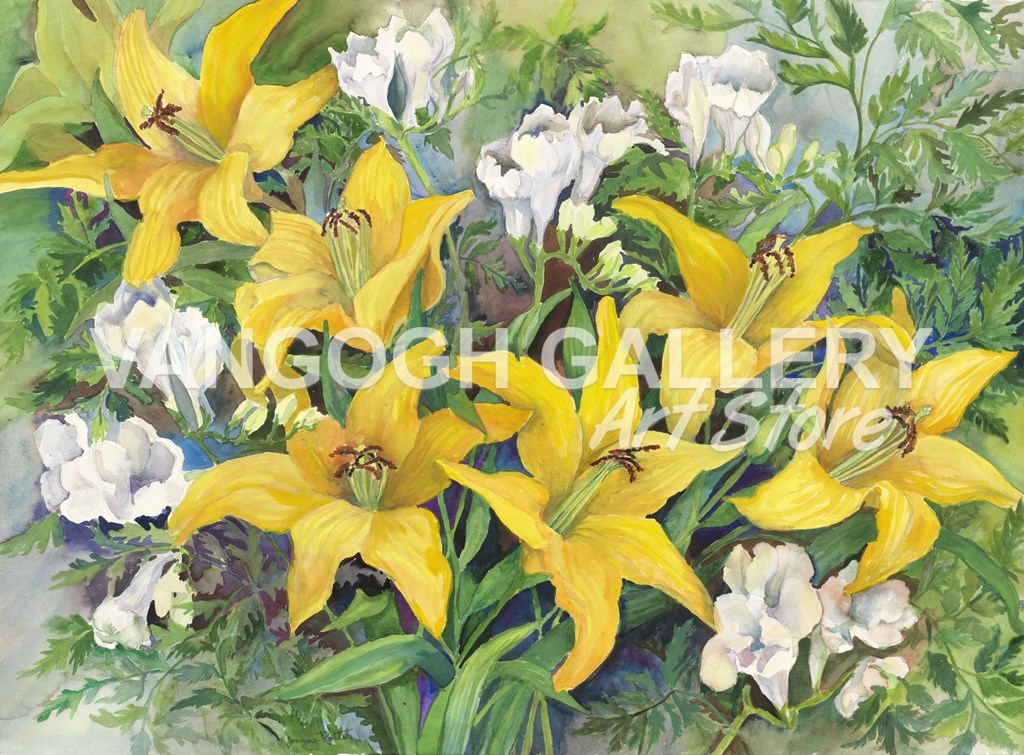 Gold Lilies And Freesia by Joanne Porter art print