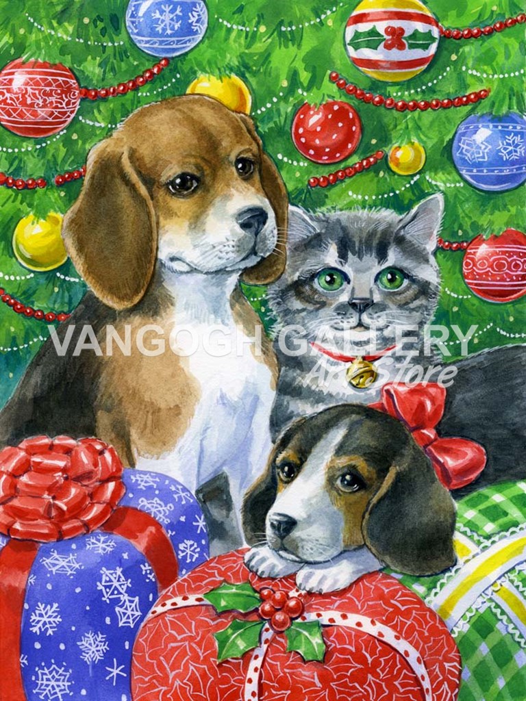 Puppies and Kitten Under the Tree by Geraldine Aikman art print