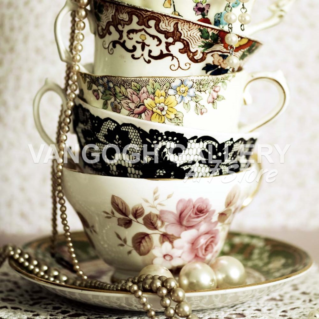 Title: Antique Cups and Saucers with Pearls 1